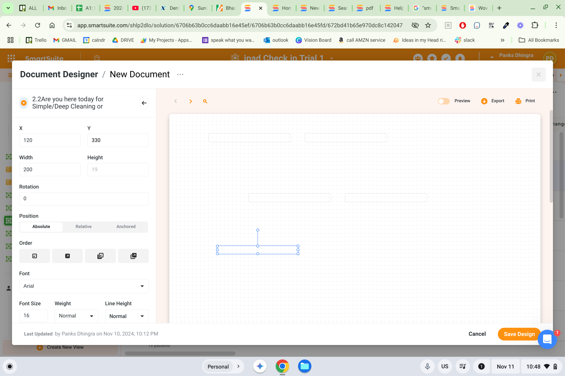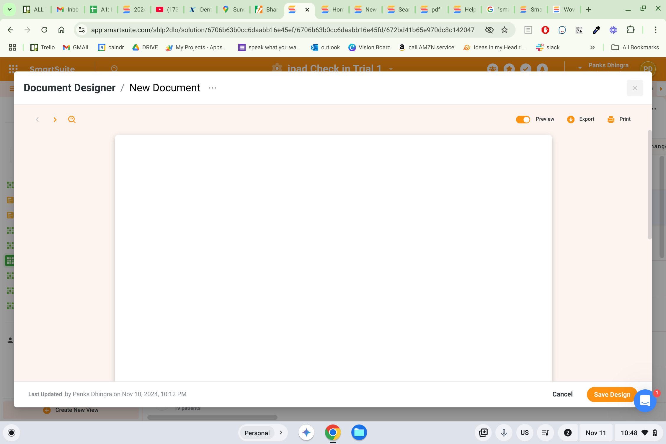This is being tried under my main application. Whenever I do click document design trying to create the template for example using last name first name Etc, everything comes out as blank page.